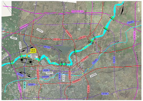 一標段南起現(xiàn)狀濟齊路,向北與虹吸干渠南路、虹吸干渠北路、吳家堡路、治黃路、規(guī)劃路相交,采用高架形式跨越太平河南支路、太平河北支路、美里路、太平河北路、濟廣高速后,在美里湖路前落地,高架橋兩側(cè)設置一對輔道實現(xiàn)各交通流向的轉(zhuǎn)換,終點接黃河大橋引橋,平面線位與規(guī)劃線位一致,道路全長3671.89米。